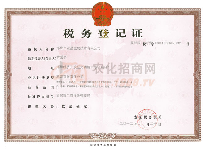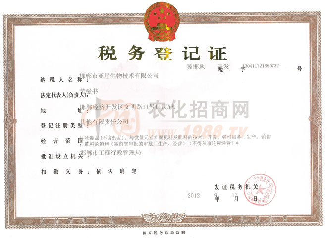 證書名稱:稅務(wù)登記證 發(fā)證機構(gòu):邯鄲市工商行政管理局