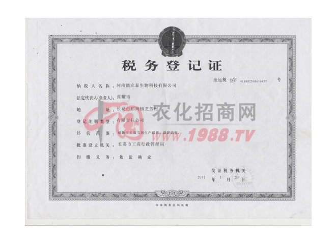 證書名稱:稅務登記證 發(fā)證機構(gòu):長葛市工商行政管理局